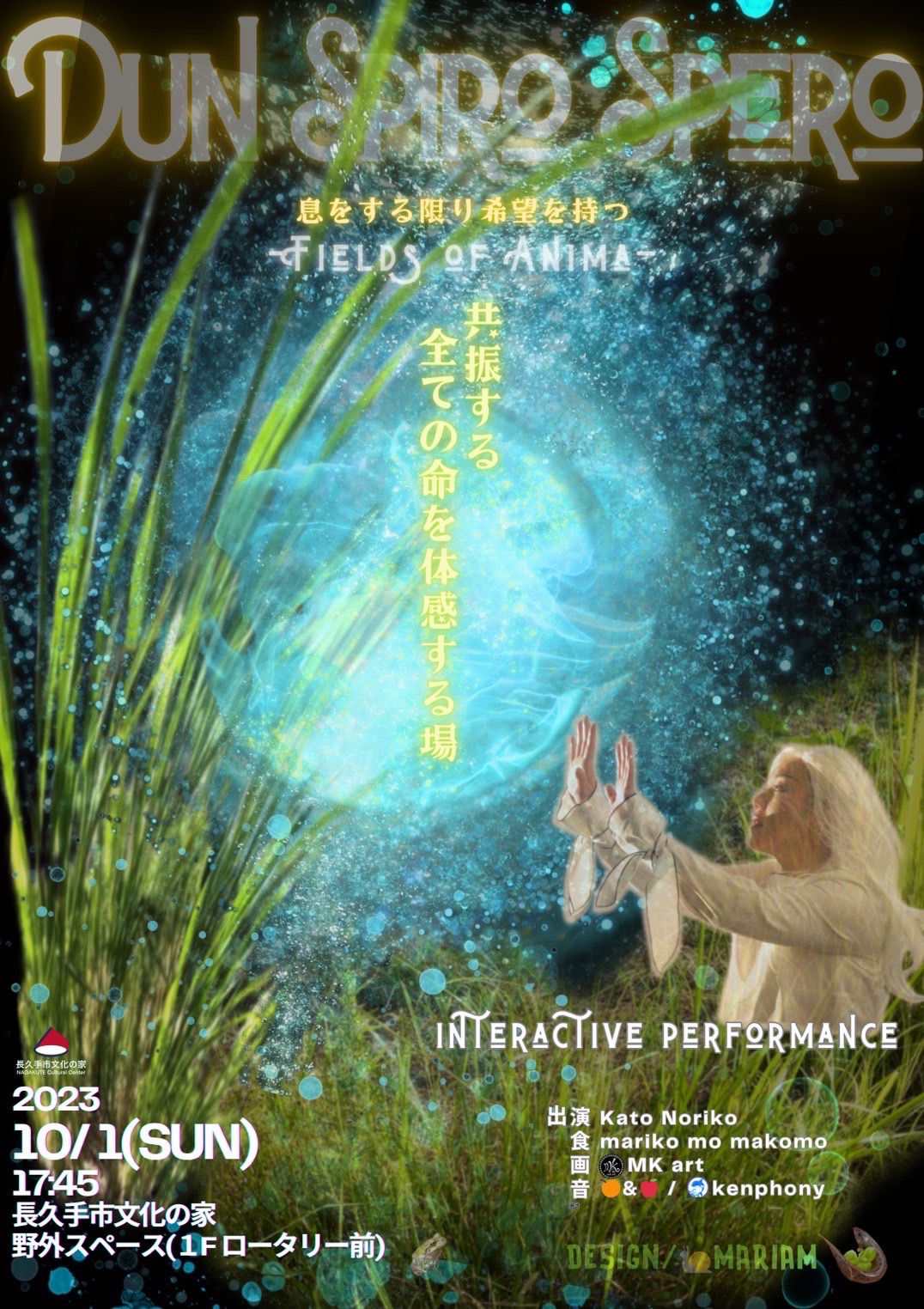 mariko mo makomoが野外スペースに自生する草花と対話しながら育てた空間を”共振する全ての命を体感する場” としNoriko Katoをナビゲーターに迎えmk artの映像投影や古来の音や食を交えながら森羅万象、繋がり広がる空間へ導き体感する時間。